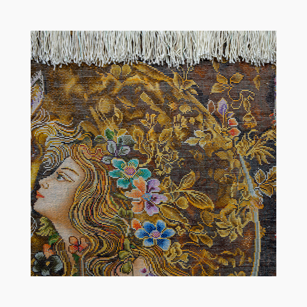 این تابلو فاخر با چلهی ابریشم، پشم مرغوب مرینوس و گلهای ابریشمی درخشان بهدست هنرمندان تبریز بافته شده و هر گرهاش، حامل نیایشی آرام و عاشقانه است.