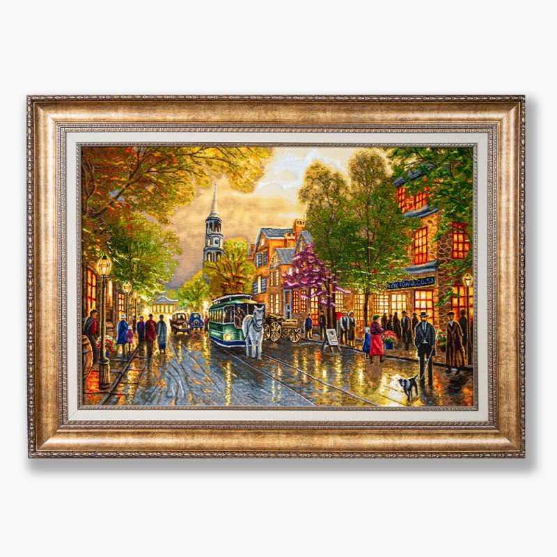 ابعاد تابلو ۱۰۰×۷۵ سانتیمتر بدون قاب و ۱۲۵×۱۰۰ سانتیمتر با قاب است — اندازهای ایدهآل برای فضاهای هنری، فرهنگی و آرام.