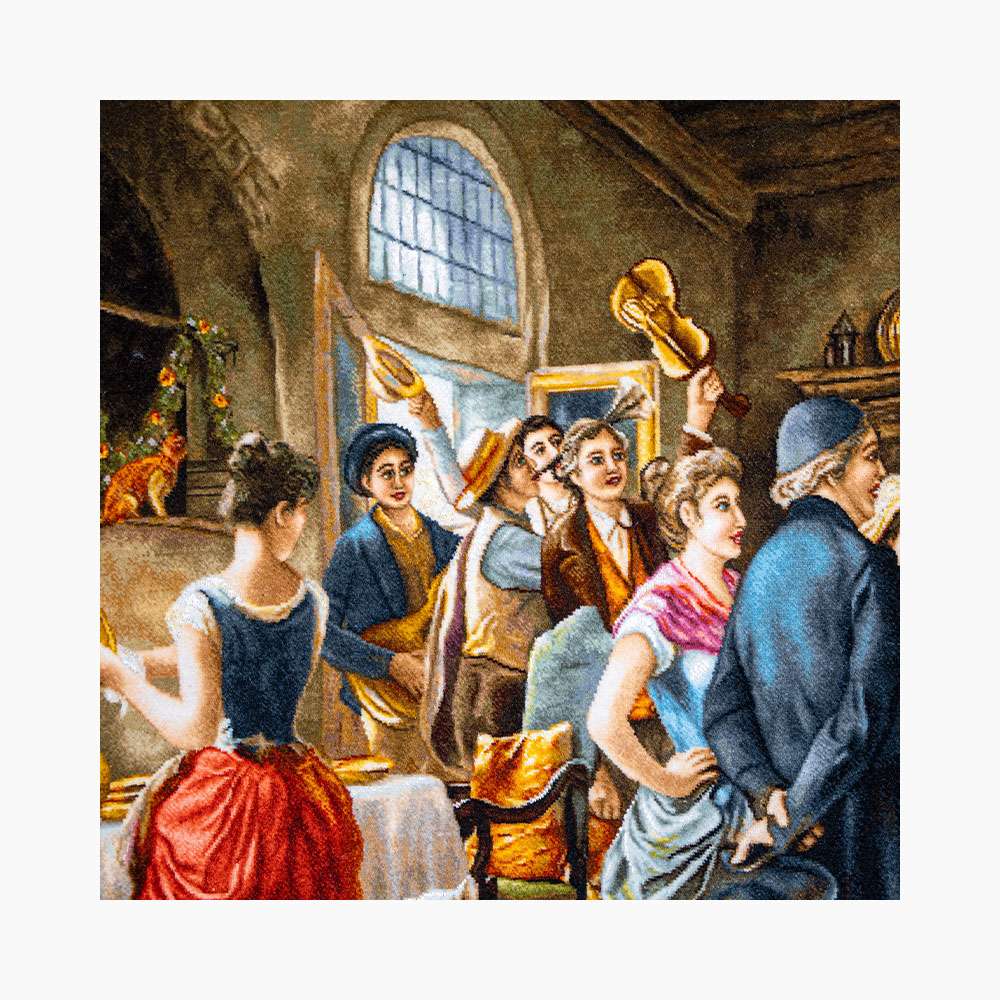 این تابلو فاخر با چله‌ی ابریشم، پشم مرغوب مرینوس و گل‌های ابریشمی درخشان به‌دست هنرمندان تبریز بافته شده و در هر گره‌اش، عشق، مهارت و معنا تنیده است.
