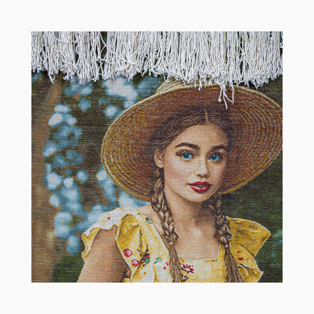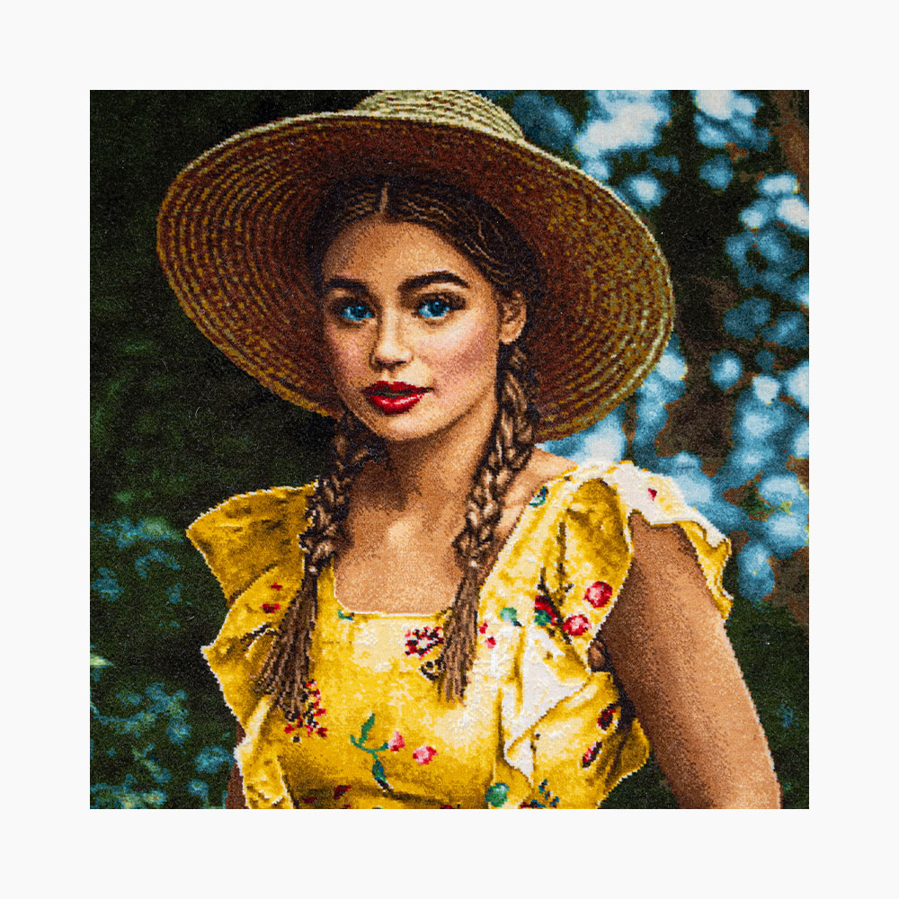 ۵۰ رج بافت ظریف و ترکیب رنگ‌های ملایم، چهره‌ی دختری را به نمایش می‌گذارد که با سادگی و لبخندش، بوی زندگی و امید را به فضا می‌پراکند.