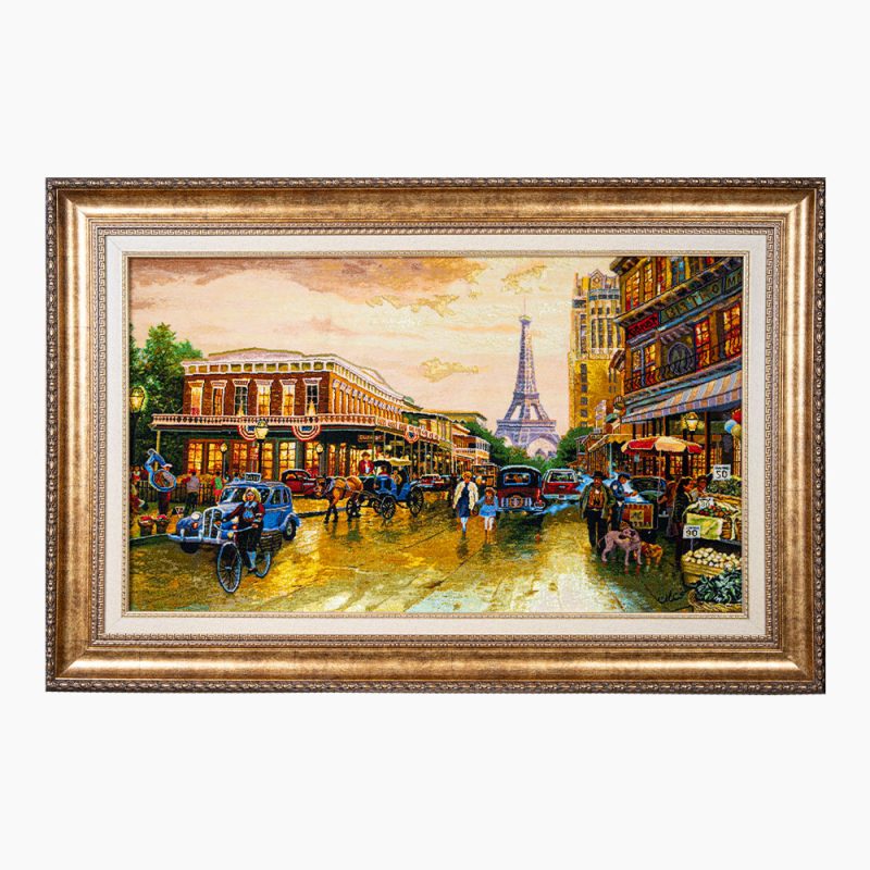 ابعاد: زمینه فرش ۹۰ در ۶۰ سانتی‌متر و با قاب چوبی نهایی ۱۱۵ در ۸۵ سانتی‌متر