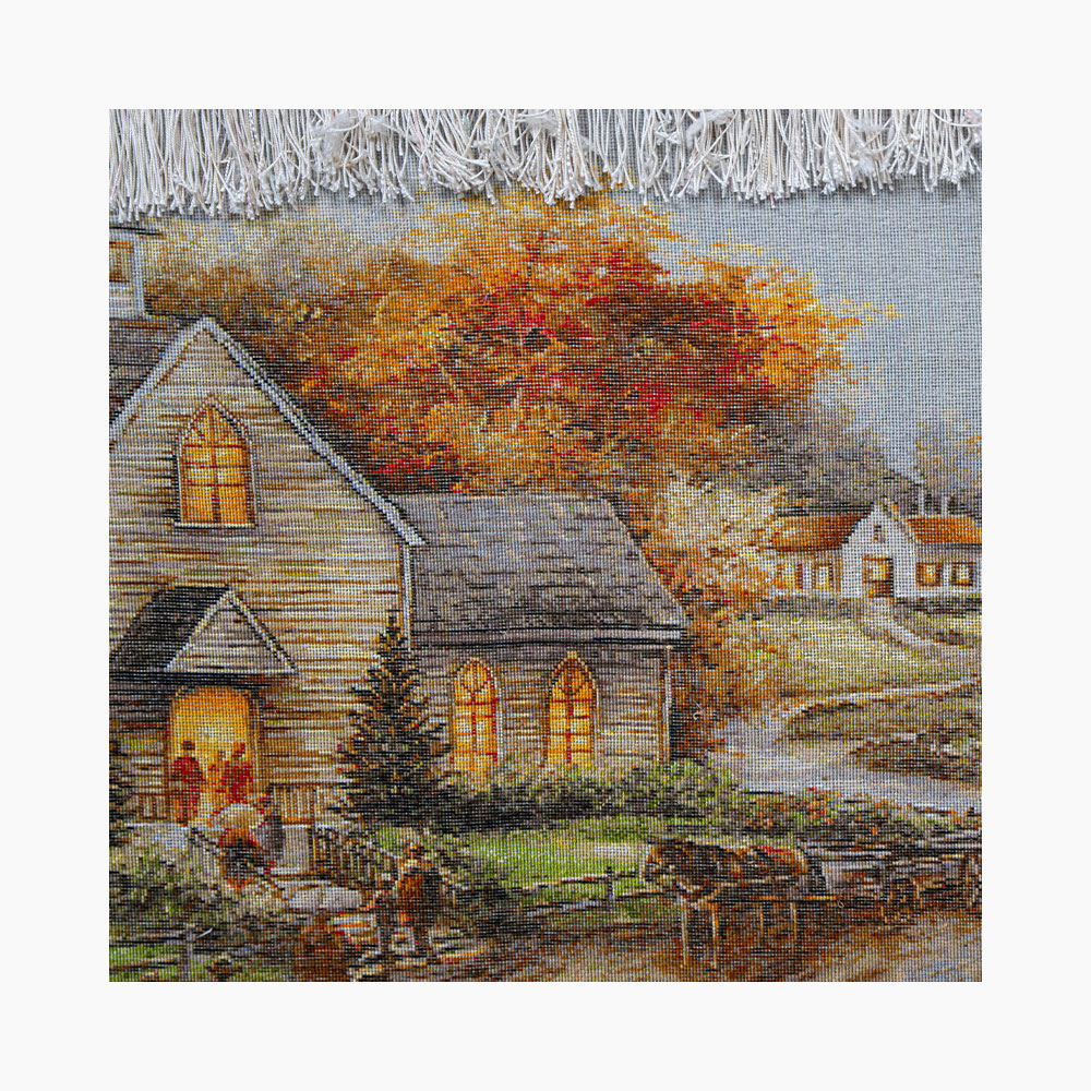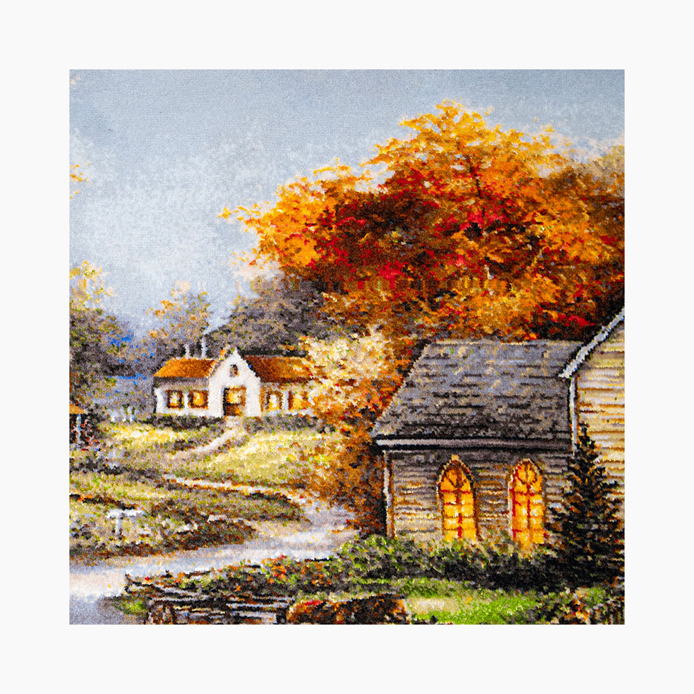 ۵۰ رج بافت ظریف و ترکیب دقیق رنگها، فضایی از سکون و لطافت را به نمایش میگذارد؛ خانههای کلاسیک با سقفهای شیروانی، مسیرهای سنگفرش و آسمانی روشن، حس زندگی آرام و مجلل دهکدههای اروپایی را تداعی میکنند.