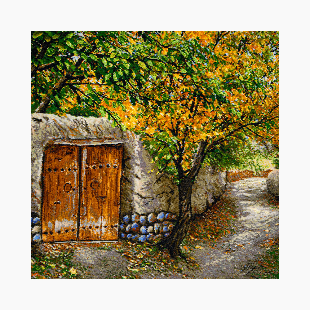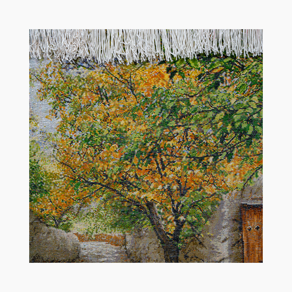 ۵۰ رج بافت ظریف، ترکیب رنگهای گرم و هارمونی متعادل آن، باعث شده تا این تابلو تصویری زنده و آرام از طبیعت ایرانی ارائه دهد.