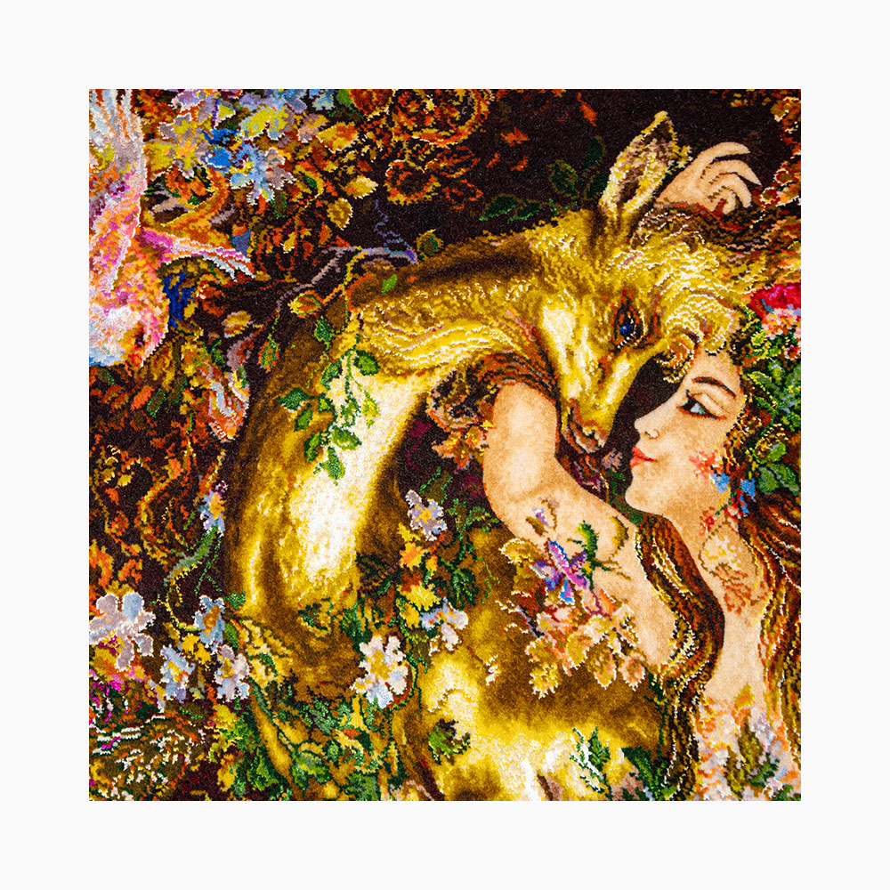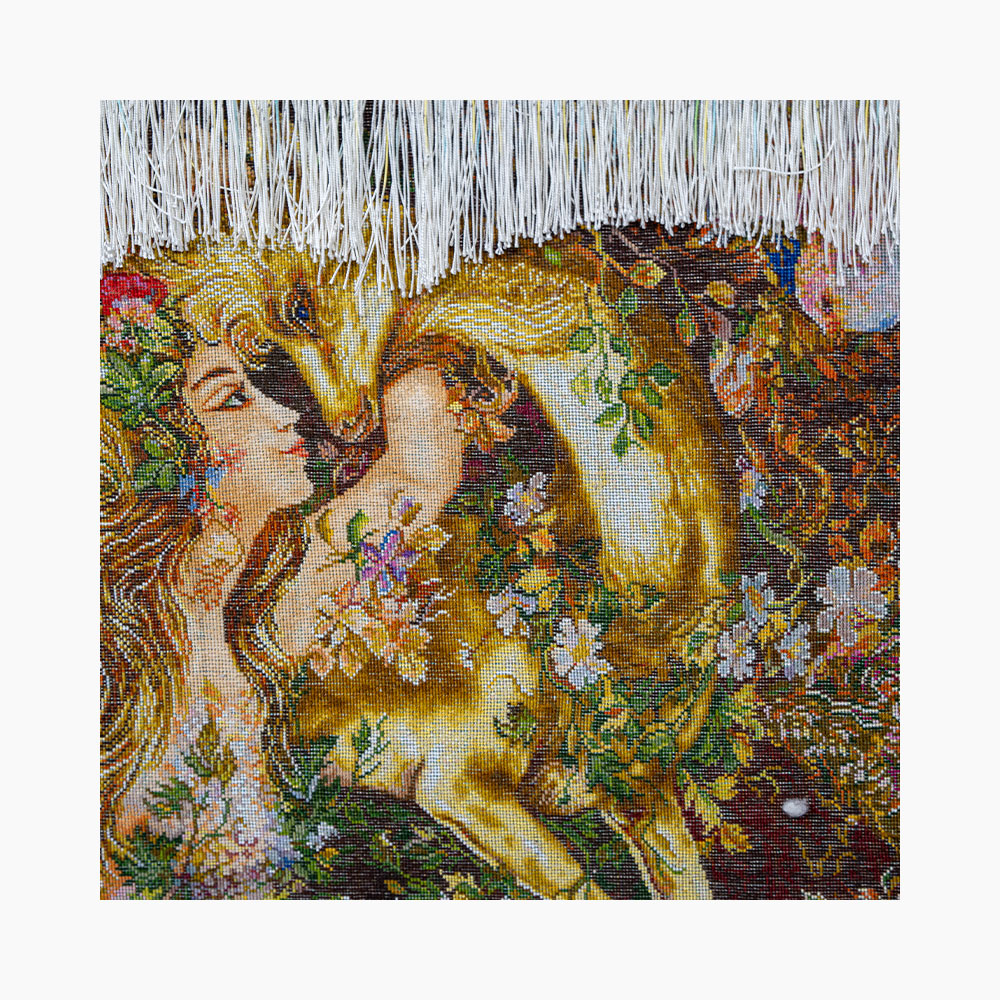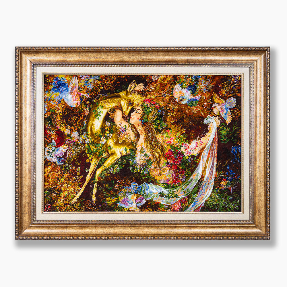 تابلوفرش امضادار «نیاز و نوازش» از مجموعهی مینیاتور، جلوهای شاعرانه از عشق و آرامش درونی است که در تار و پود هنر ایرانی به شکلی بیهمتا نقش بسته است.