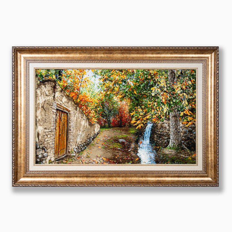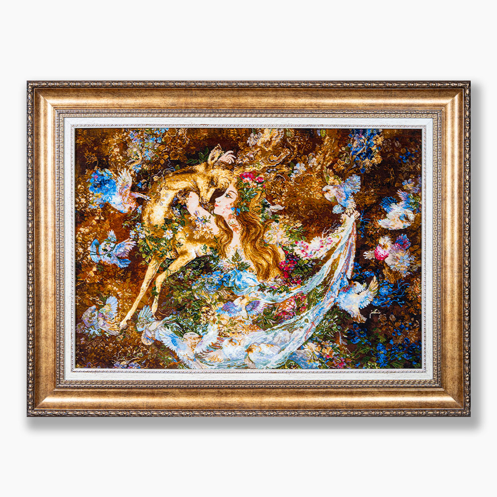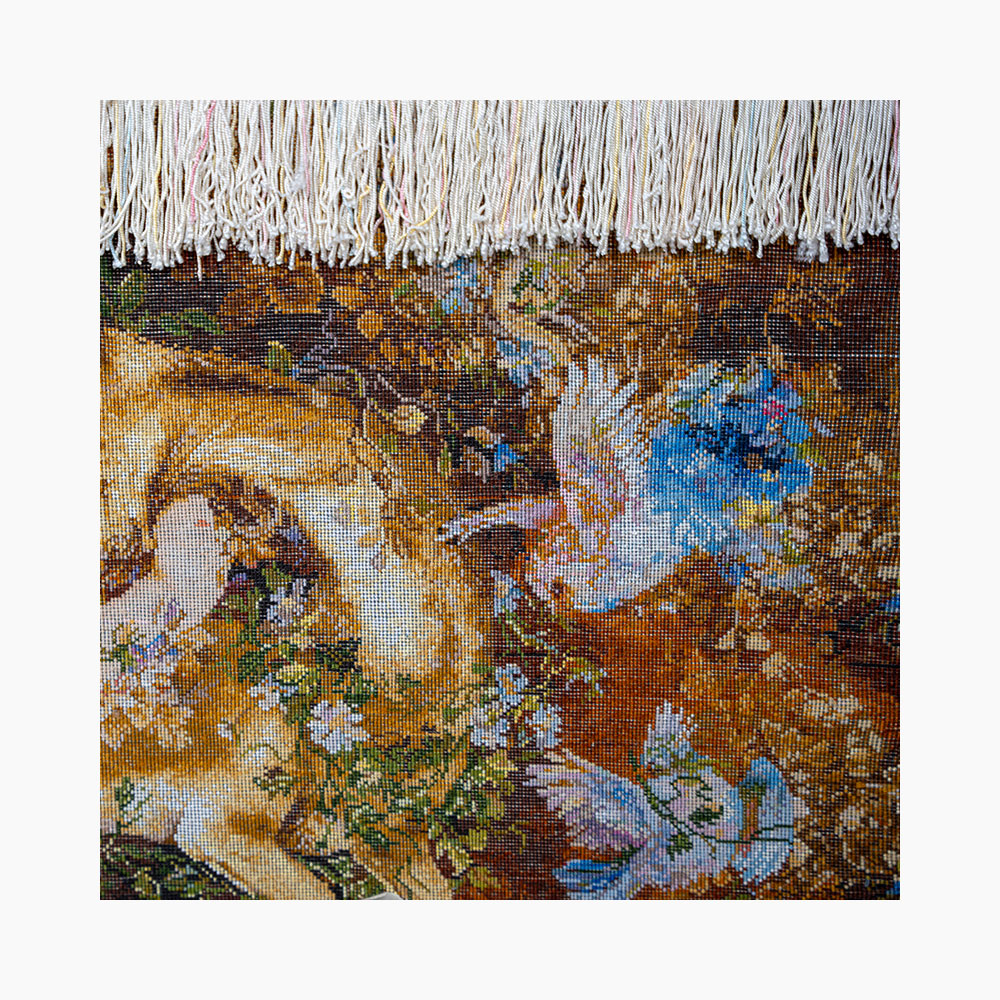 این تابلو نفیس با چله‌ی ابریشم، پشم مرغوب مرینوس و گل‌های ابریشمی درخشان توسط هنرمندان تبریز بافته شده و در هر گره‌ی آن، احساس، معنا و مهارت نهفته است.