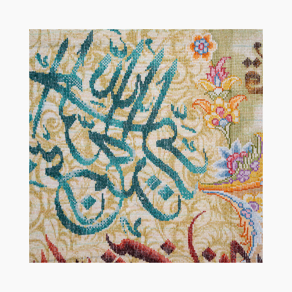 این تابلو با چلهی نخ، پشم مرغوب مرینوس و گلهای ابریشمی درخشان بهدست هنرمندان تبریز بافته شده و در هر گرهاش، ایمان، ظرافت و هنر تنیده شده است.