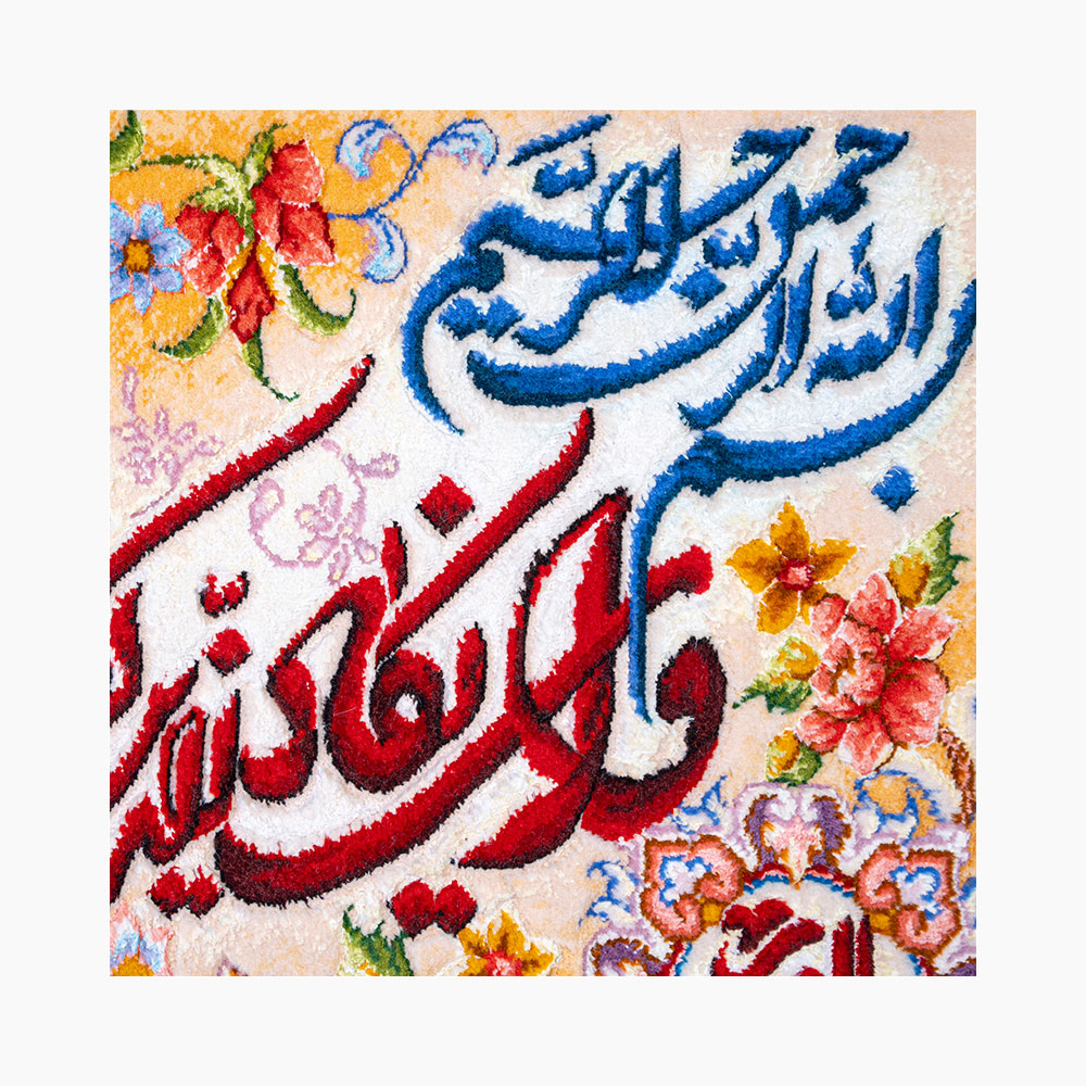 ۵۰ رج بافت ظریف، نقش خوشنویسی آیهی شریف «وَإِن يَكَادُ الَّذِينَ كَفَرُوا لَيُزْلِقُونَكَ بِأَبْصَارِهِمْ…» را در ترکیبی زیبا از رنگ، خط و نقش زینتی به نمایش میگذارد.