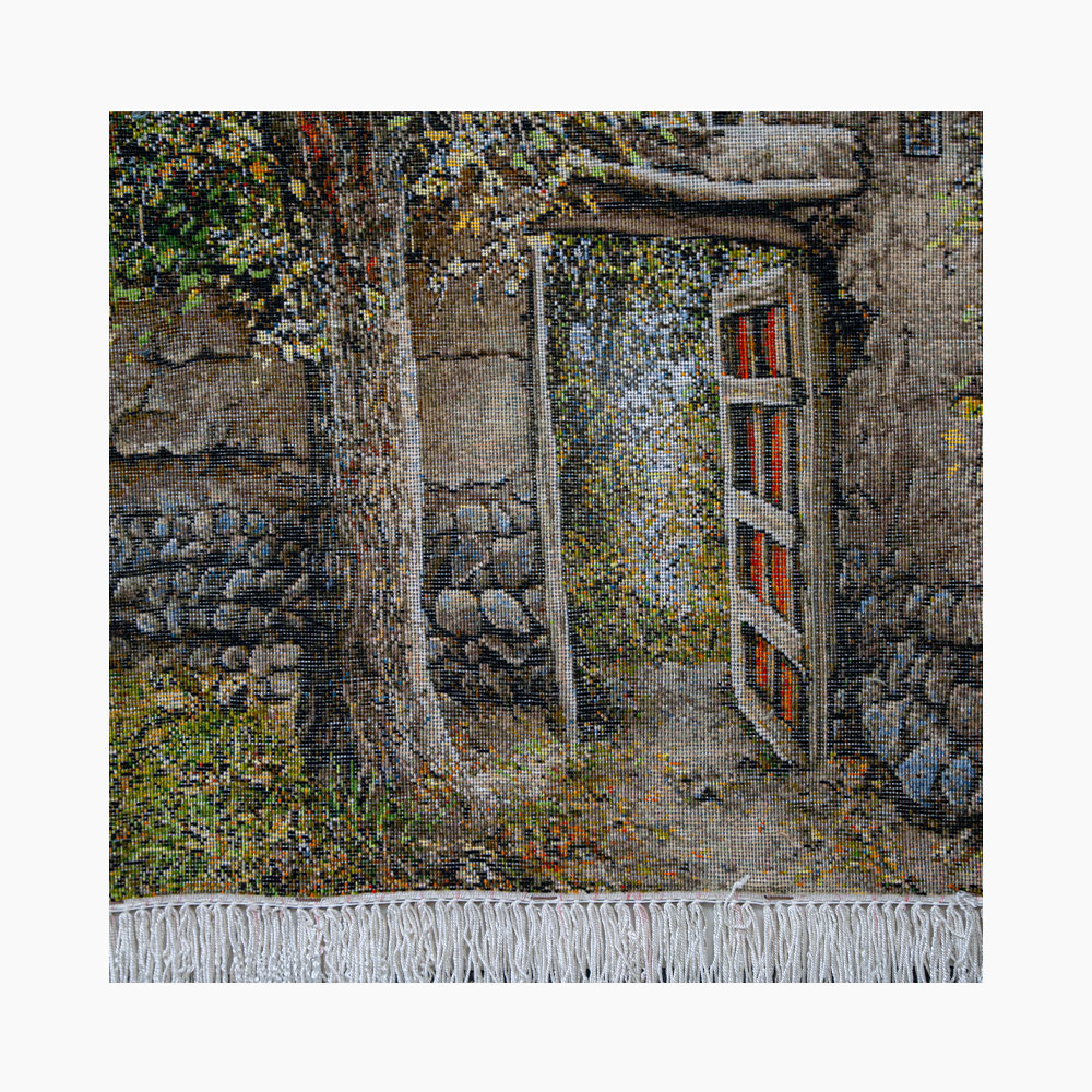 در این تابلو فرش، از چله نخ محکم و پشم مرینوس درجهیک برای بافت استفاده شده و با گلهای ابریشم طبیعی تزئین شده است تا درخششی ملایم و عمق بصری چشمگیری ایجاد کند.