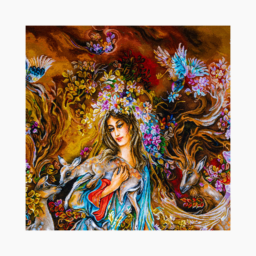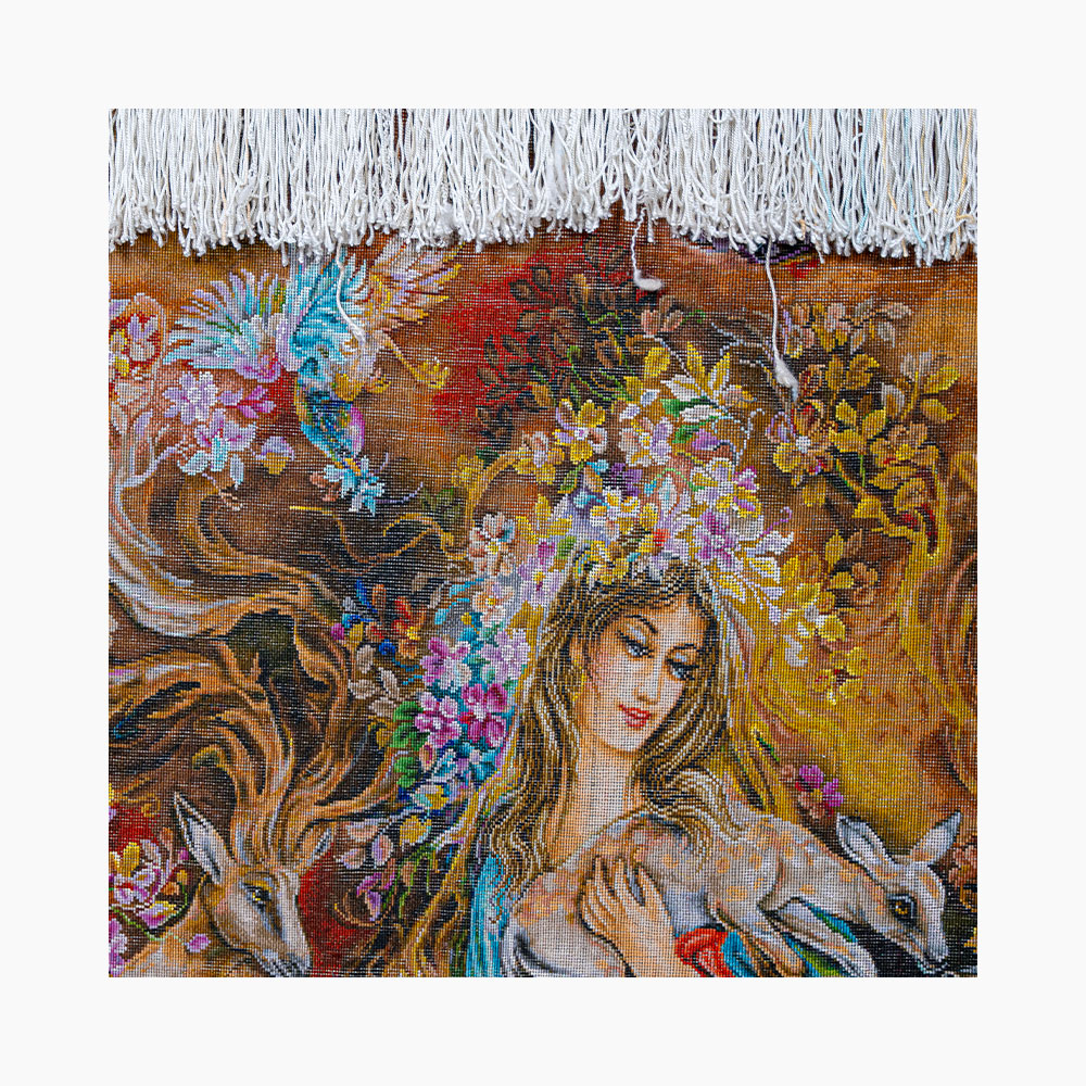 این اثر فاخر با چلهی ابریشم، پشم مرغوب مرینوس درجهیک و گلهای ابریشمی درخشان بهدست هنرمندان چیرهدست تبریز بافته شده و در هر تار و پود آن، روح هنر اصیل ایرانی جاری است.