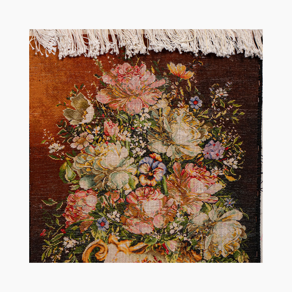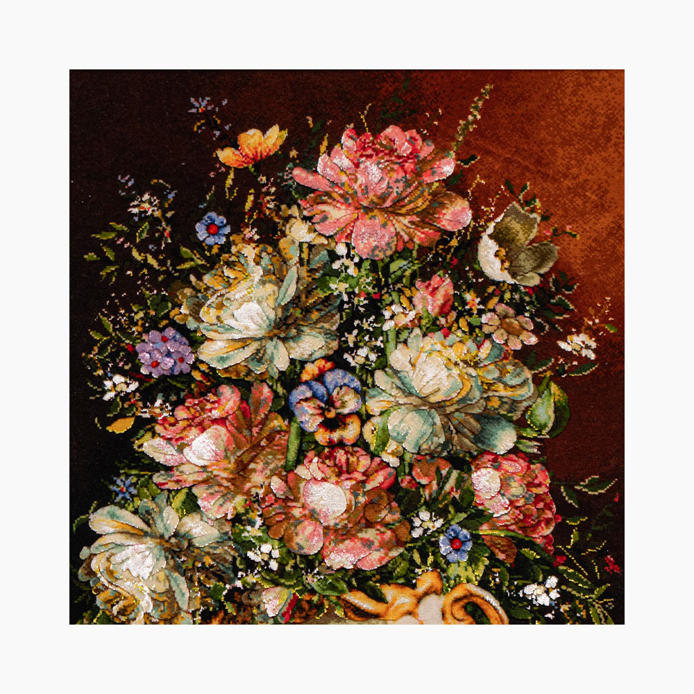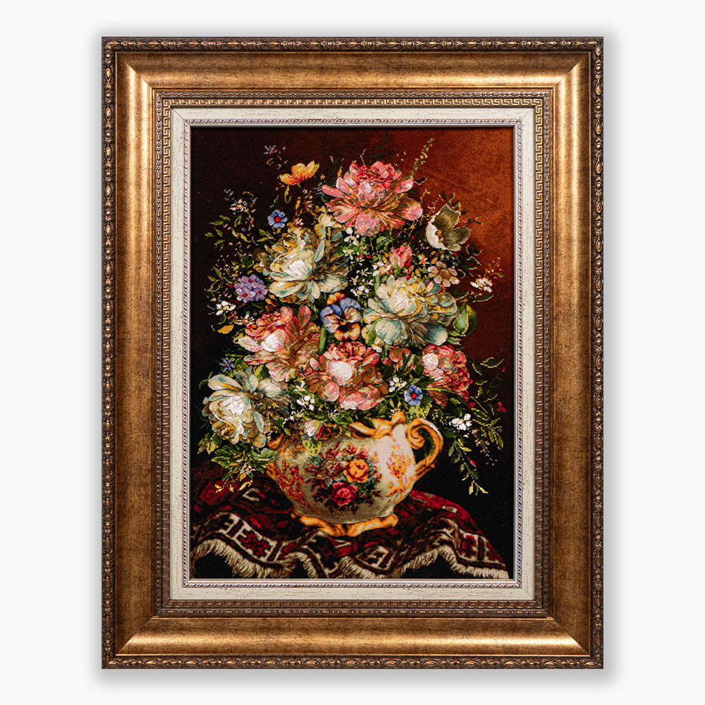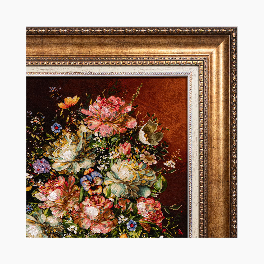 این تابلو با چلهی نخ، پشم مرغوب مرینوس و گلهای ابریشمی توسط هنرمندان تبریز بافته شده و با بافت برجستهی درجهیک، عمق، بُعد و ظرافت بیشتری به طرح بخشیده است؛ گویی گلها از بوم بیرون زدهاند و در آستانهی شکفتناند.