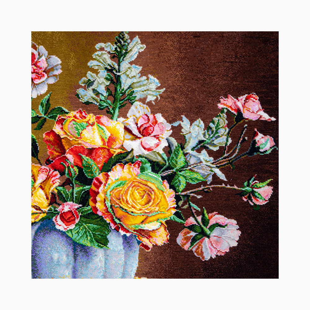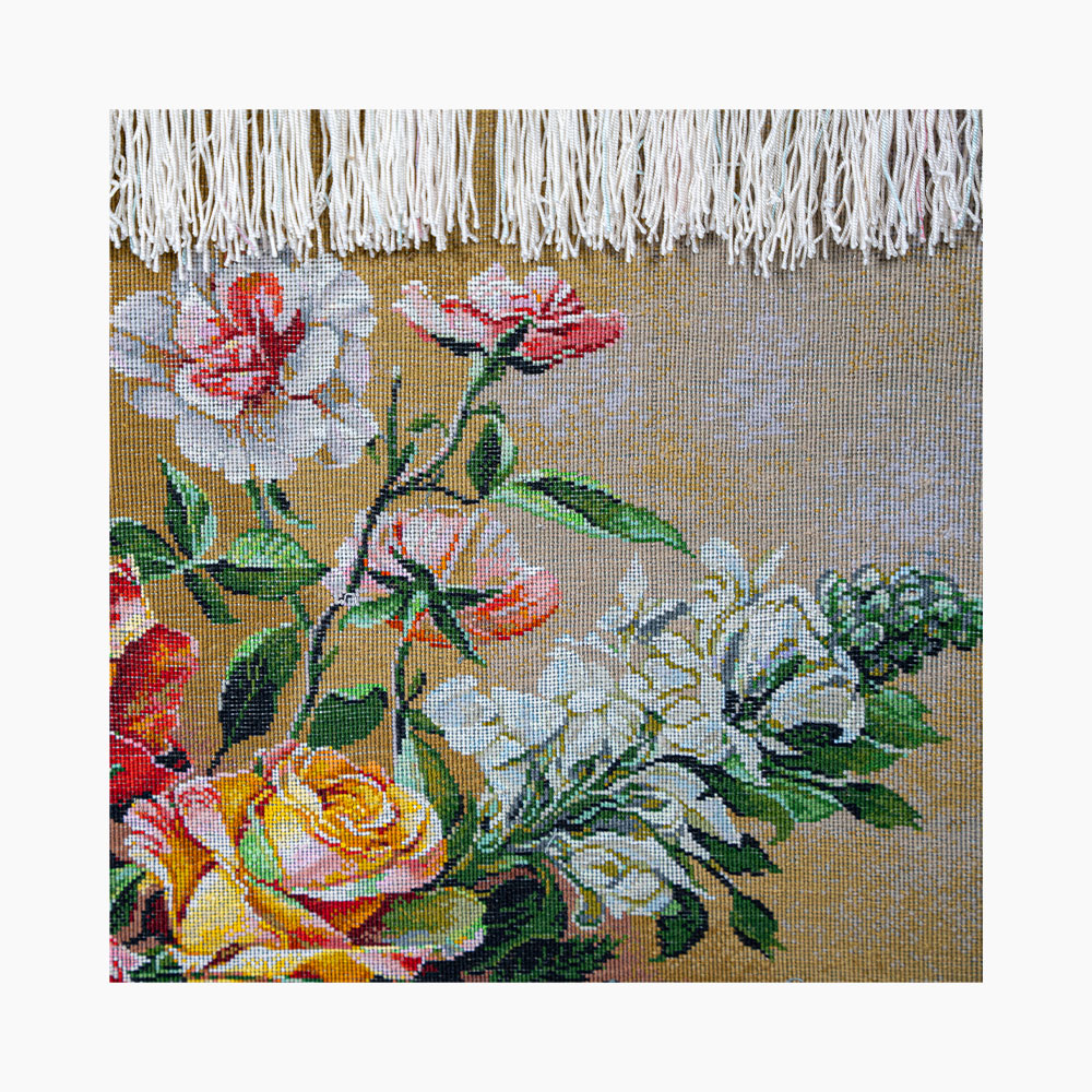 ۵۰ رج بافت ظریف در کنار هماهنگی بینظیر رنگهای رز، طلایی و زیتونی، فضایی خلق کرده که در آن گلهای رز در میان نقوش الهامگرفته از ترمهی ایرانی میدرخشند.